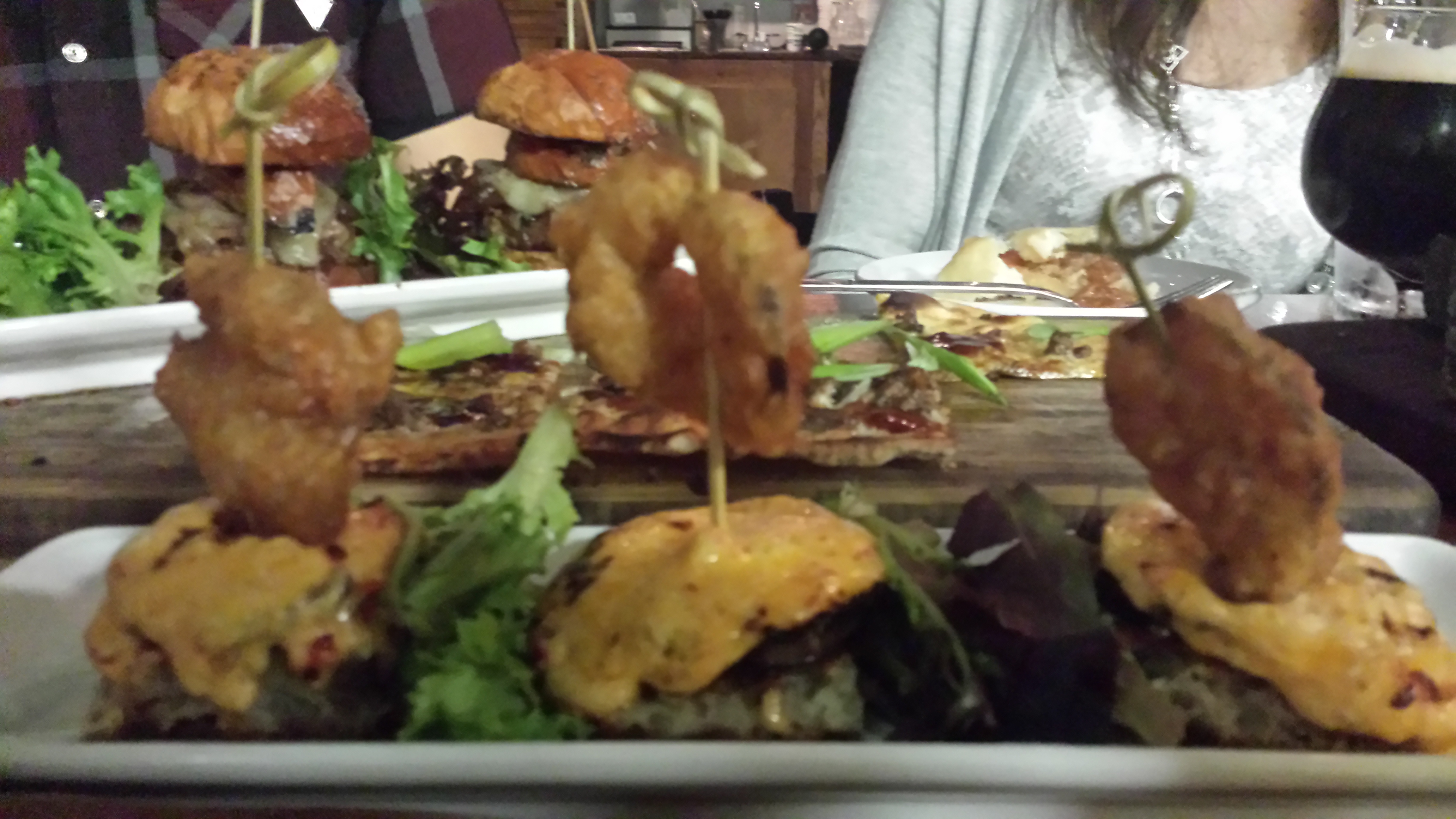 Then came the tapas-style plates of twisted deliciousness: Duck flatbread. Salmon belly tacos. Lamb meatballs with forest mushroom cream and fried basil. Free-range chicken with smoked jalapeno bacon. Brushcetta with a balsamic-fig reduction. Ground brisket and porterhouse tail mini burgers. Unbelievable combinations that tantalized our taste buds.